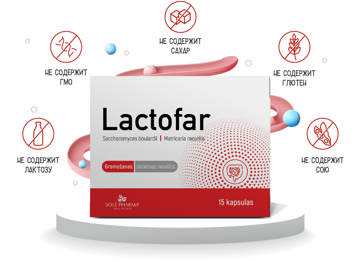 Lactofar представляет собой комбинацию Saccharomyces boulardii и экстракта ромашки, которая способствует здоровью пищеварительной системы и предотвращает чувство дискомфорта.